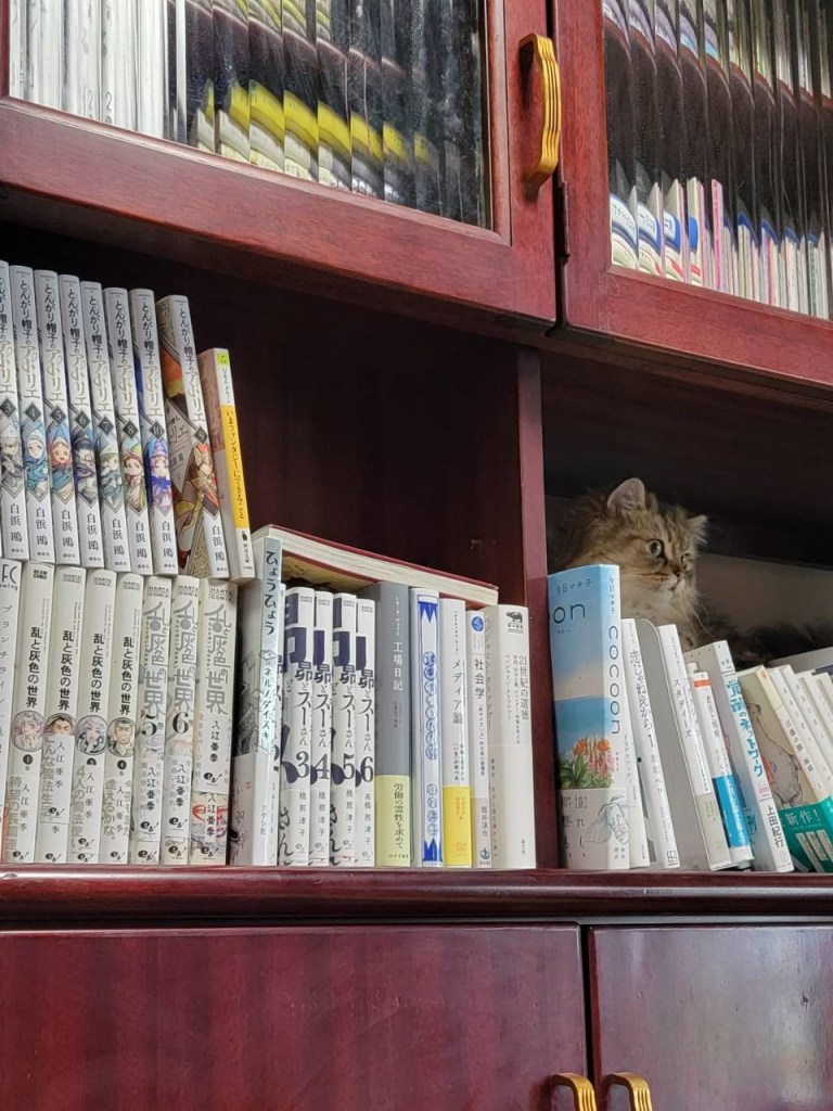よくみたら、こんぶに本棚に登られているな。まあいいか。