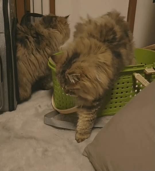 保護猫カフェにはなかった「ふわふわの床(カーペット)」に戸惑う猫たち。手前がこんぶ、奥がひじきです。