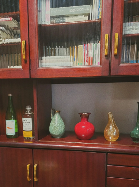 丸一年前と比べて、圧倒的に埋まってきているもの、それは、本棚。花瓶を並べ、かわいい酒瓶も並べ、ひろびろと使っていたはずが、いつの間にかギュウギュウの本棚に……。