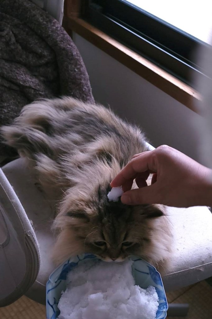 東京では久しぶりの積雪。猫にとっては人生で初めての雪。