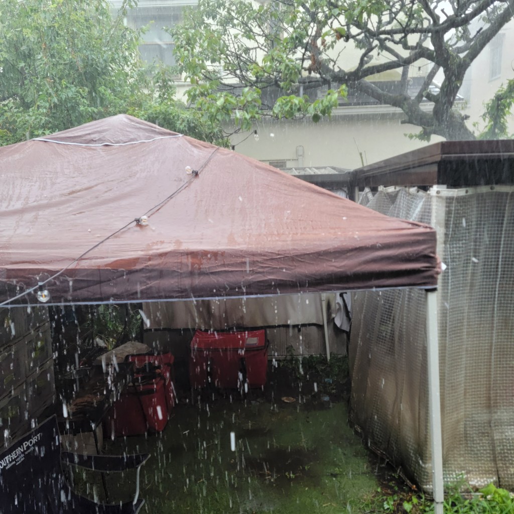 雨対策&荷物置き場拡大のため、庭にタープを設置。これで暑い日差しの中でも作業がしやすい……はず。冷凍庫におしぼりも大量に用意し、暑かったら冷凍おしぼりを首に巻いてね……などと、用意できる範囲でもてなしの工夫をするも、最終的には暑さや雨にはかないません。