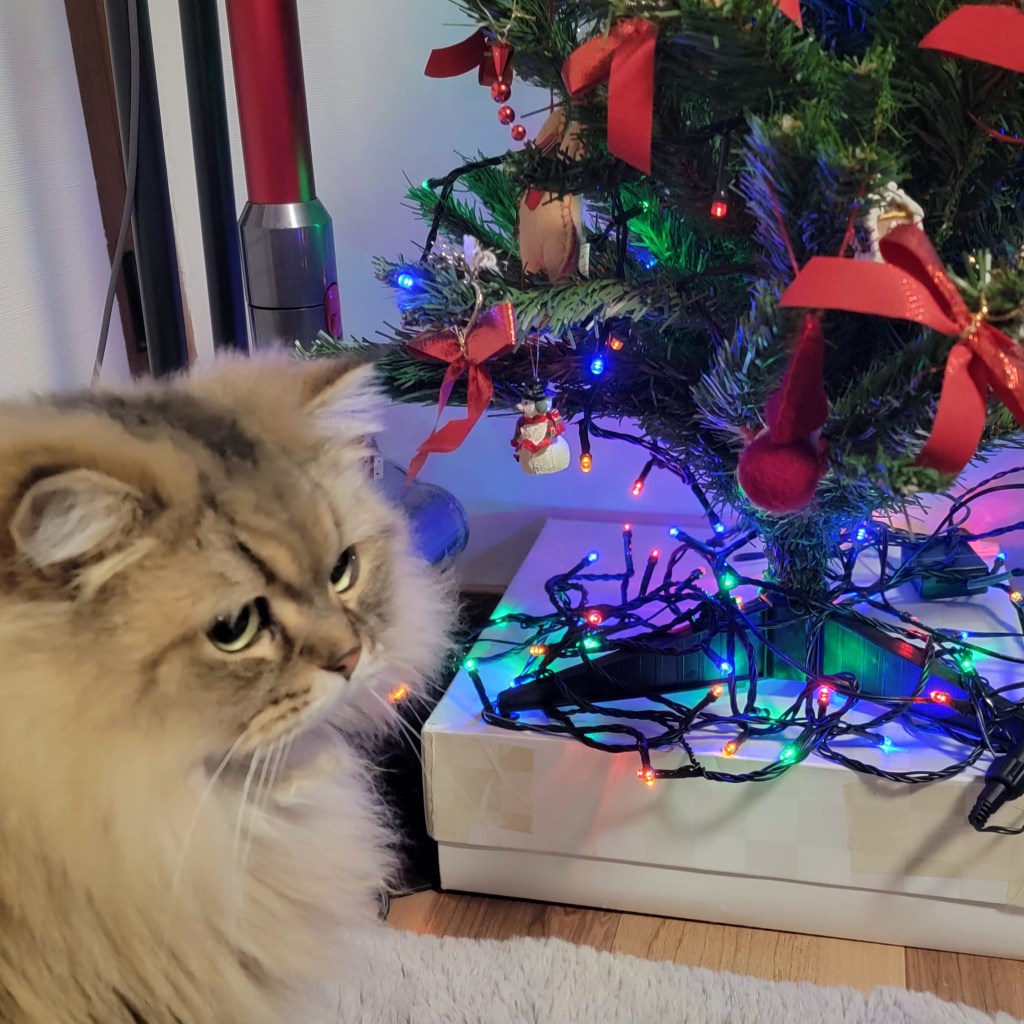 ところが、2023年はツリーのライトを灯し続けてみたところ、どうもねこたちにとって「おもちゃ掛け」から「家電」に認識が変わった様子。1回もひっぺがさないどころか、眺めたりしていて、穏やかなものです。不思議だけれど、ありがたい。人間の理にのっとってくれて、ありがとう。
