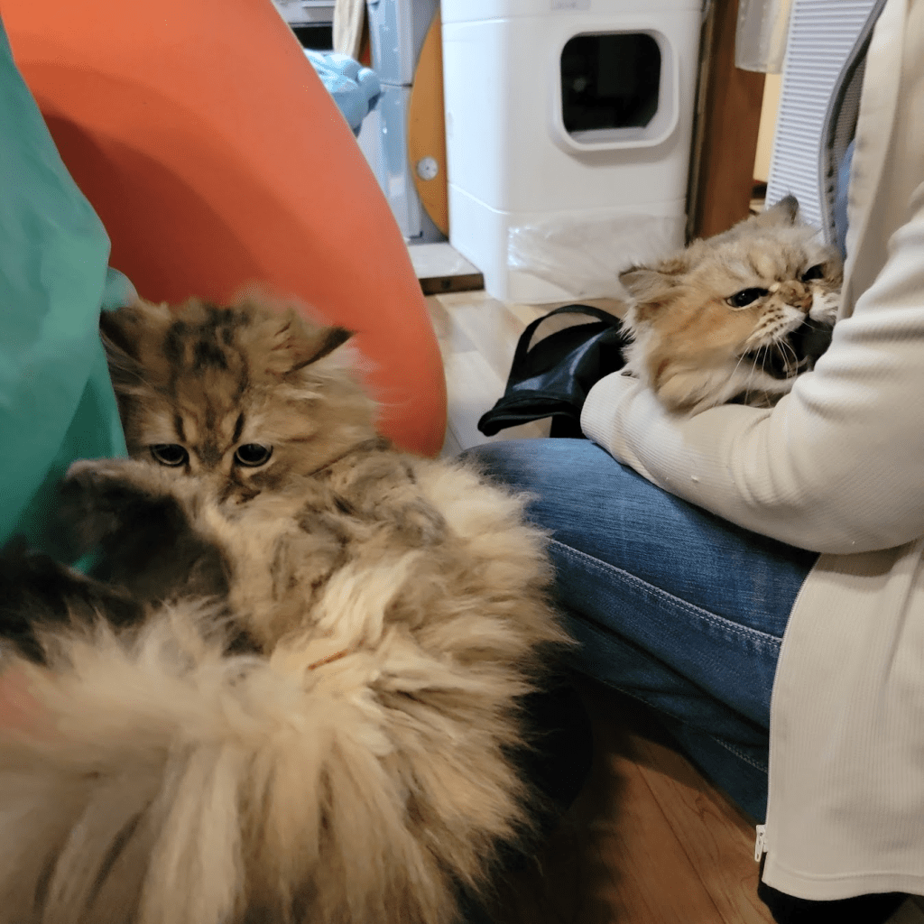 置きっぱなしのスズランテープを嚙まれていたり、人が多くて疲れたねこちゃんたちがクッションにおもらしをしたりと、住居じゃなくなってきたことに慣れていないのは家主だけではなく猫も一緒。