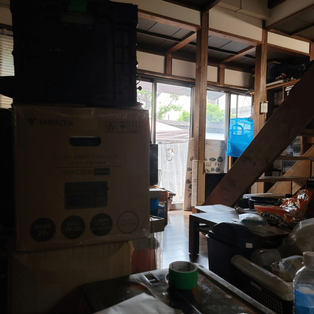 イベント終了に伴い、荷物が戻ってきた〈えだまめ家〉。今年のイベントは雨天だったゆえに、撤収作業が全然進まず、整理途中の備品たちがたっぷり戻ってきてしまいました。
