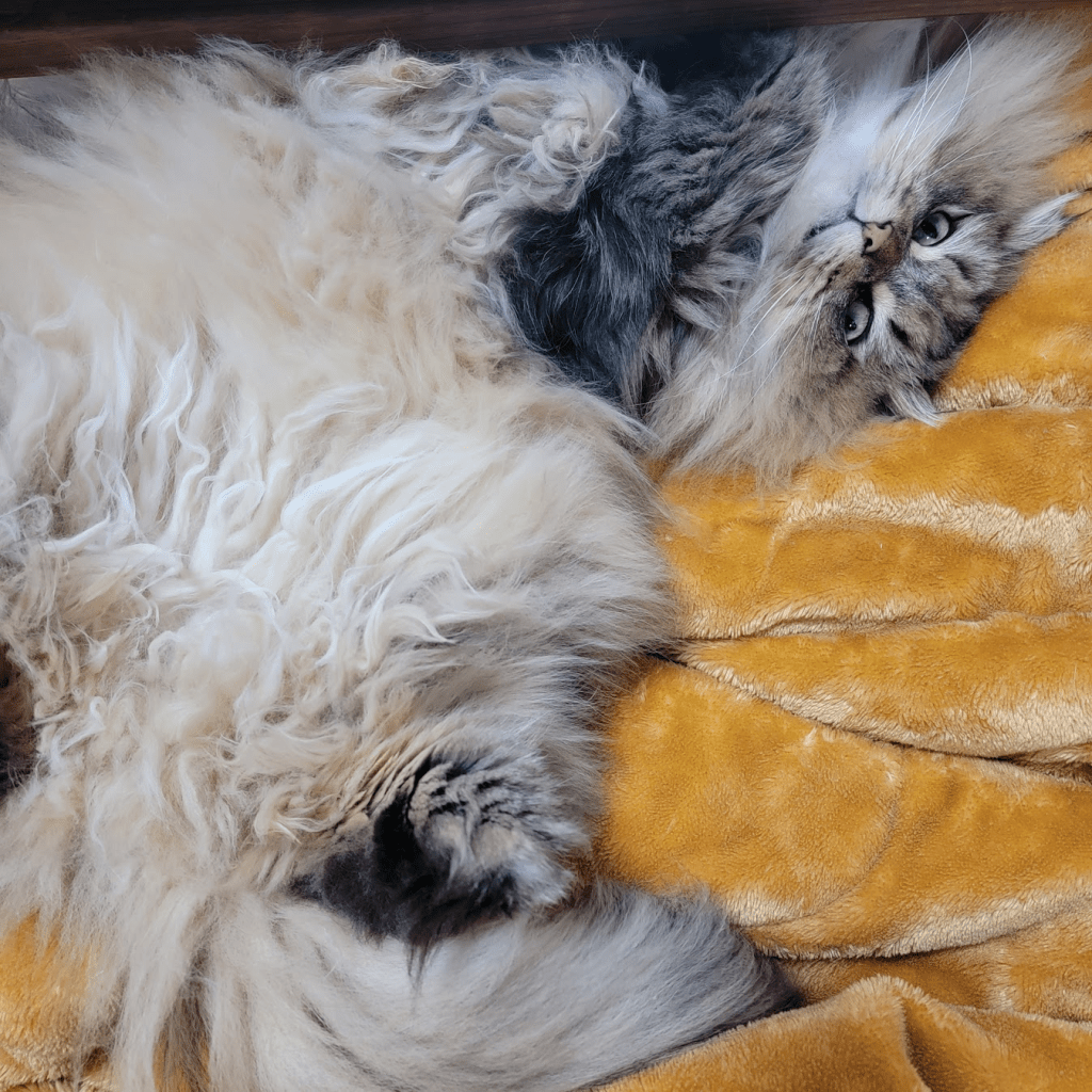 寒い日が続く、〈えだまめ家〉。床のモフモフラグに飽き足らず、黄色い大きな毛布が大活躍。人間はフリースを着て暖をとりますが、猫は冬毛で暖をとります。